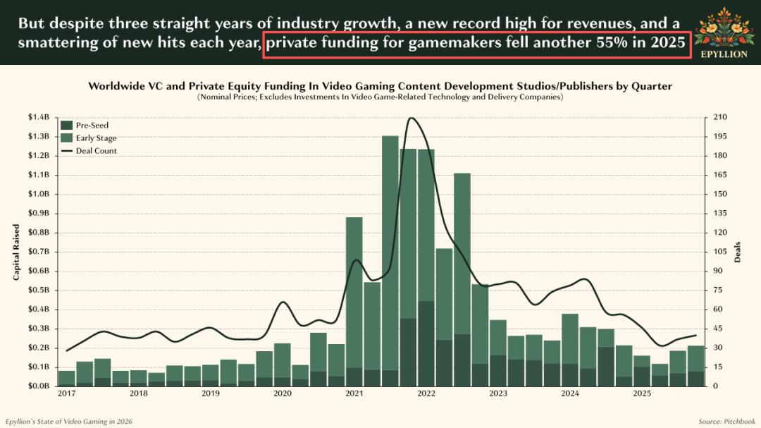 整体来看,欧美游戏市场的投资环境已明显转冷。根据风投基金Epyllion在2月份发布的《2026年电子游戏现状报告》,2025年全球游戏行业的私人投资额暴跌了55%。