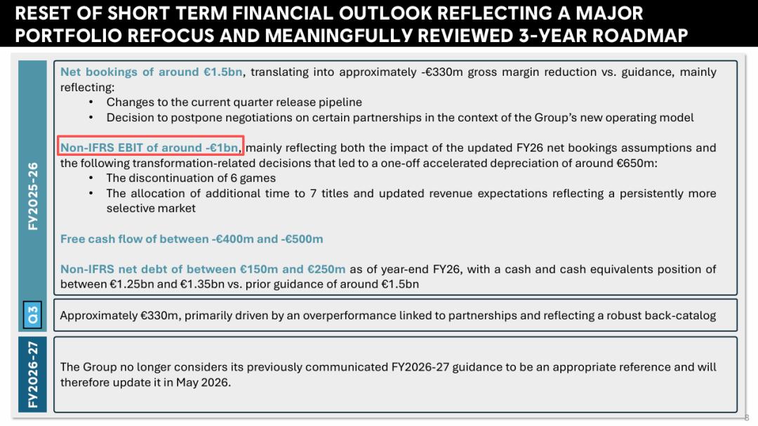 综合影响下,育碧预计本财年Non-IFRS(非国际财务报告准则)运营亏损预计将达到10亿欧元左右,远高于此前“接近零亏损”的预期。