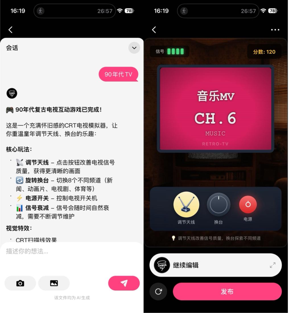比如,用户只需要输入“90年代TV”,Loopit的创作引擎也能在几分钟内完善创意,生成一个可以调频道的互动内容。