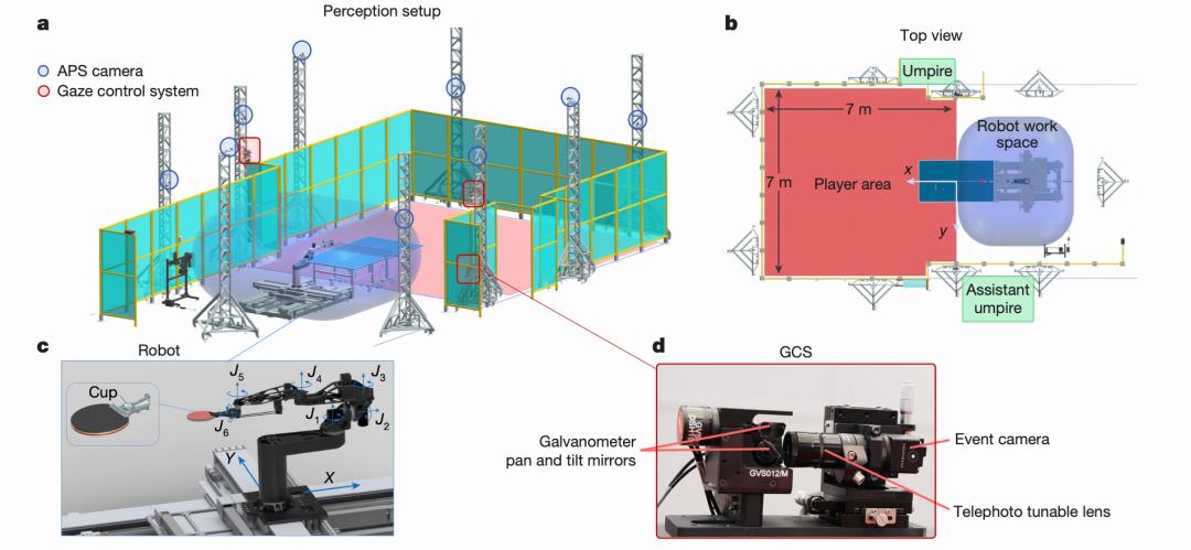 图|Ace 系统。其中,感知系统通过普通摄像头定位球的位置,并借助 3 套注视控制系统(Gaze Control System,GCS)估算球的旋转速率(即角速度),其摄像头全部架设在球台以外,覆盖整个比赛区域;这些信息被基于 AI 的控制系统利用,指导比赛中的发球与回球;控制系统的决策则由 1 个配备 8 个独立控制关节的机械臂完成。