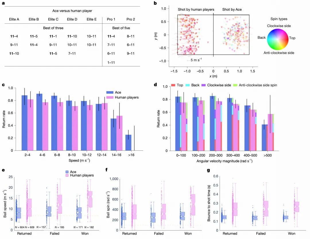 据论文描述,在国际乒乓球联合会(ITTF)规则下,Ace 站在真实的乒乓球台旁,使用真实的乒乓球拍和乒乓球,击败了 3 位人类精英选手,即使在面对 2 位日本职业乒乓球联赛(T.League)选手时,也出人意料地赢下了 7 局比赛中的 1 局。