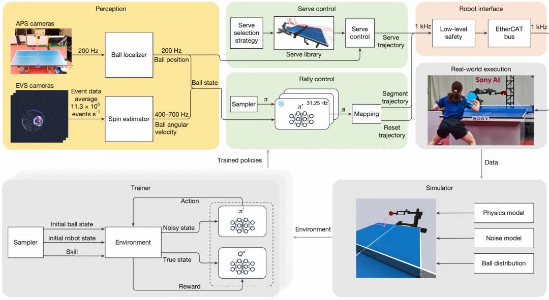 Ace 的控制策略采用 model-free 强化学习训练,这意味着系统不需要预先建立一套“球在空气中如何运动”“拍子如何与球接触”的解析模型,而是通过大量仿真对打直接学习动作策略。训练过程遵循“决策-评分”(actor-critic)架构,决策模块给出动作,评分模块评估该动作的长期回报,两者交替优化。通过这一过程,Ace 不仅能完成基本的回球,还能主动给回球赋予期望的旋转特性,比如上旋。
