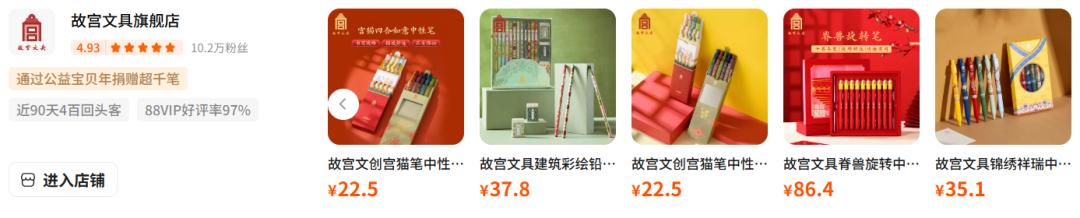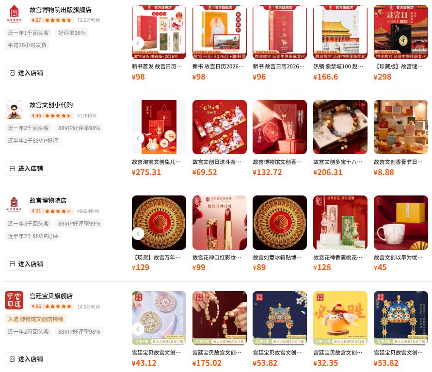 比如故宫博物院店铺的产品涵盖首饰、文具、家居、玩具/潮玩、美妆/香氛、服饰/包袋、陶瓷/玻璃制品、日历/书画等;