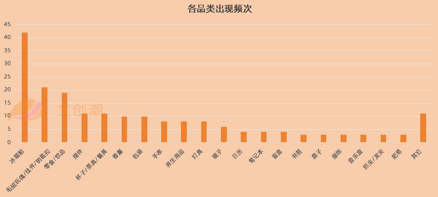 统计粉丝超十万的店铺中销量前十的产品,其中出现次数最多的品类也是冰箱贴。甚至,在湖南省博物馆旗舰店,热销前十里甚至有八款都是冰箱贴。