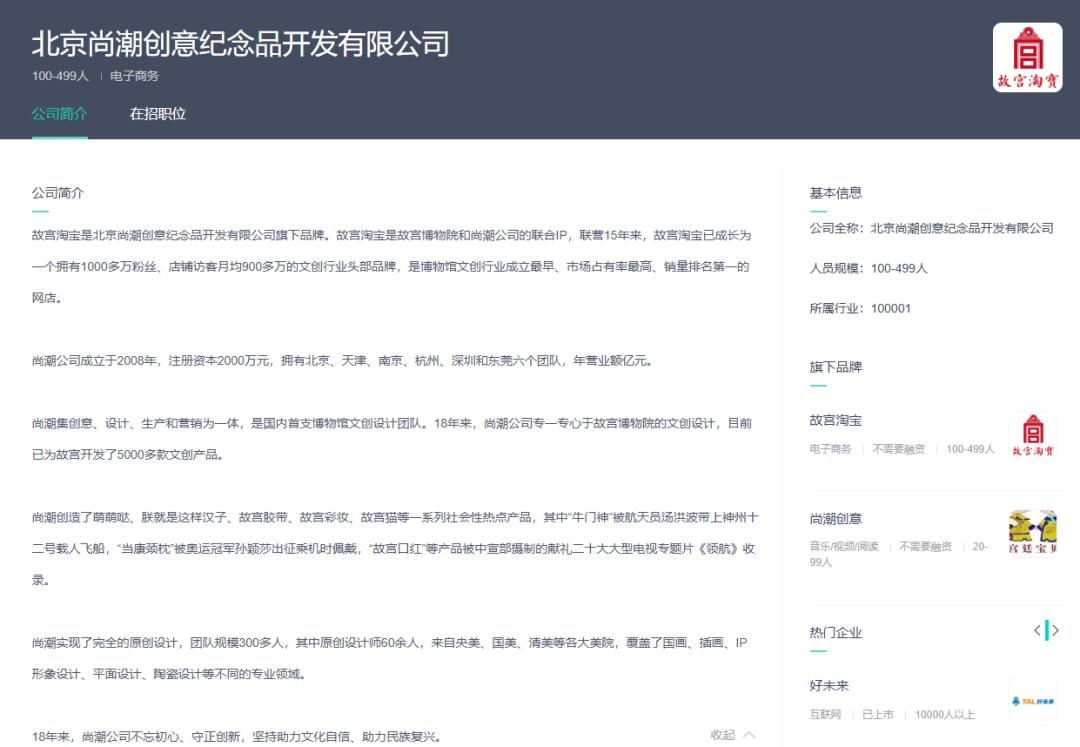 另外也有部分是代运营店或者与其他机构合作的品牌,比如“上新了文创旗舰店”,是故宫与北京广播电视台联合出品的电视节目《上新了·故宫》的衍生文创品牌;故宫淘宝是故宫博物院和北京尚潮创意纪念品开发有限公司的合作品牌,后者成立于2008年,表示在北京、杭州、深圳和东莞等六地拥有团队,成员规模300多人,年营业额亿元,目前已为故宫开发了5000多款文创产品,创造朕就是这样汉子、故宫胶带、故宫彩妆、故宫猫等热点产品。