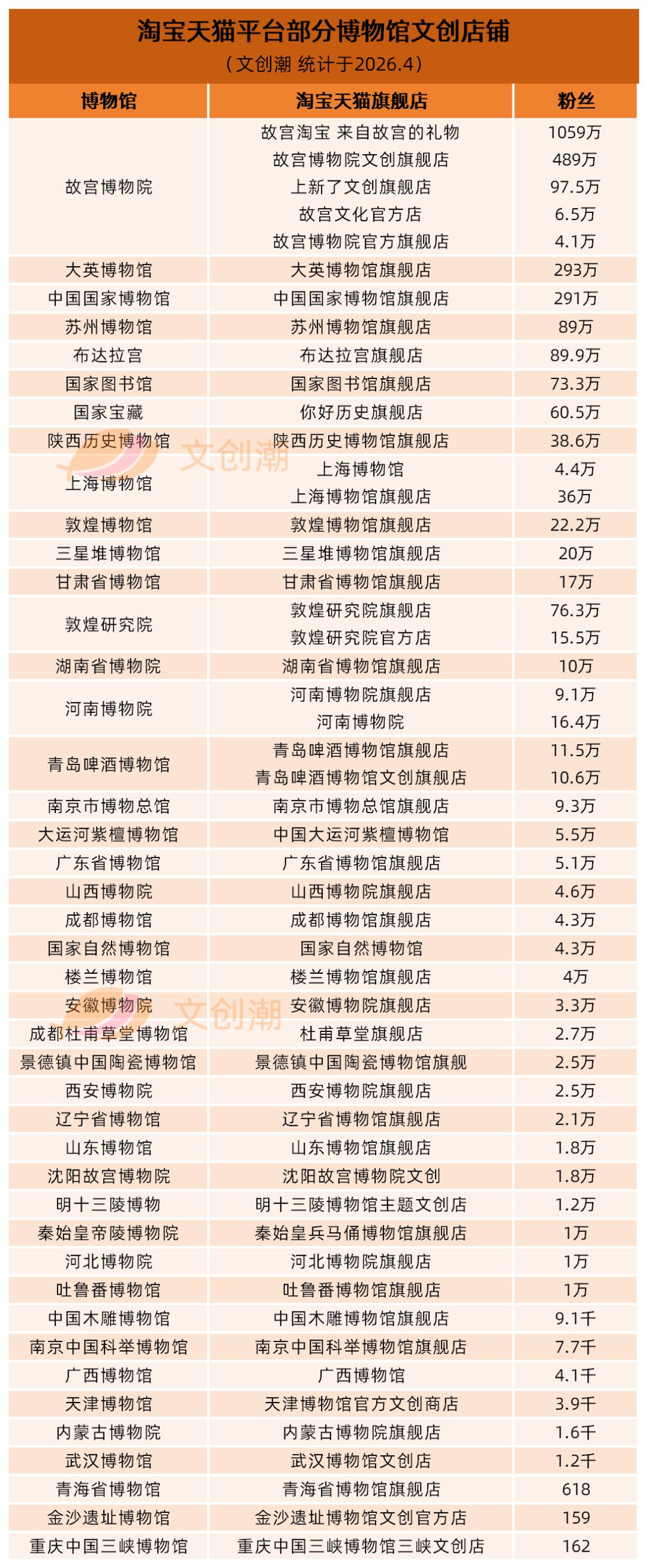 文创潮统计到,目前淘宝天猫平台上粉丝数超过10万的博物馆有16家,分别是: