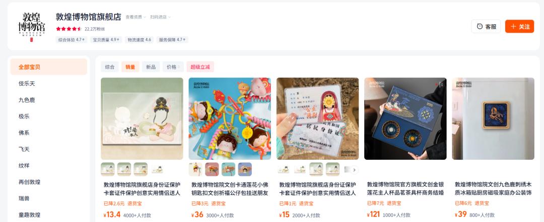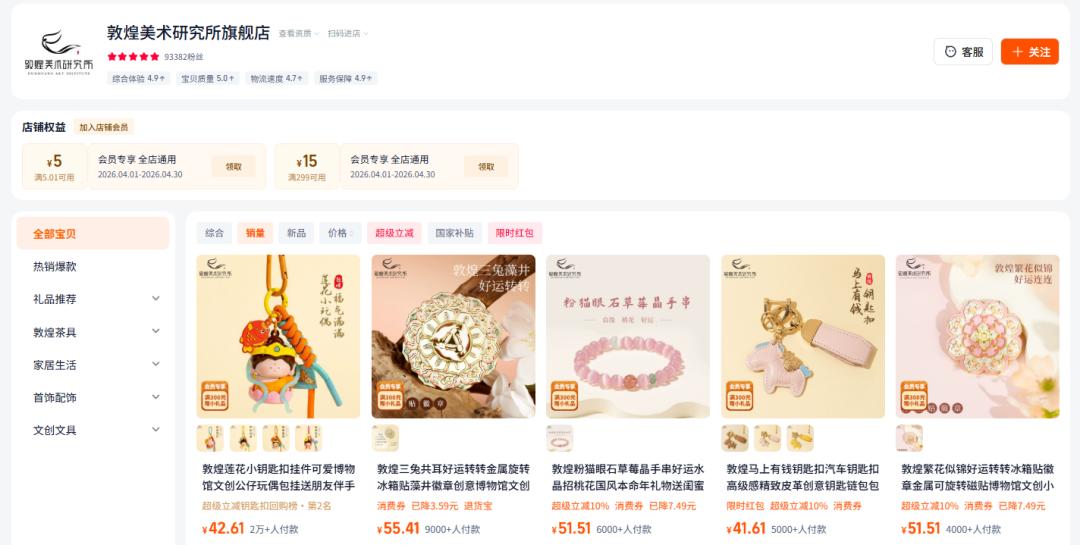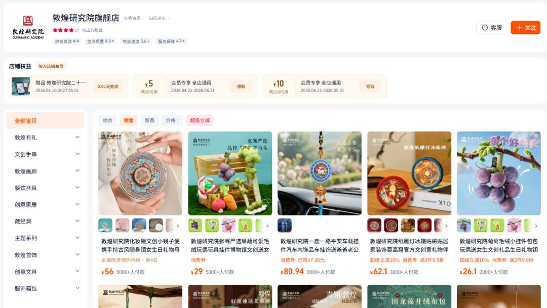 敦煌博物馆店铺则以家居百货、服饰/包包、出行/户外、办公/文具、数码/周边、玩具/潮玩等居多……