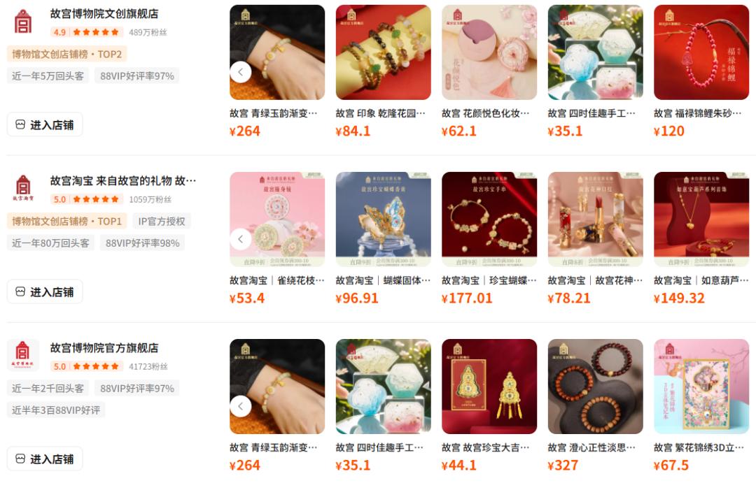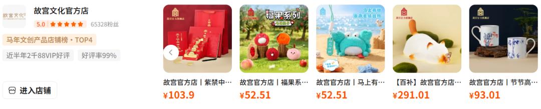 故宫:采取多元化合作方式,在淘宝天猫平台的文创店铺主要包括故宫淘宝、故宫博物院文创旗舰店、上新了文创旗舰店、故宫文化官方店和故宫博物院官方旗舰店。(注:还有主打图书的故宫博物院出版旗舰店、主打文具的故宫文具旗舰店和主打食品的朕的心意旗舰店等)