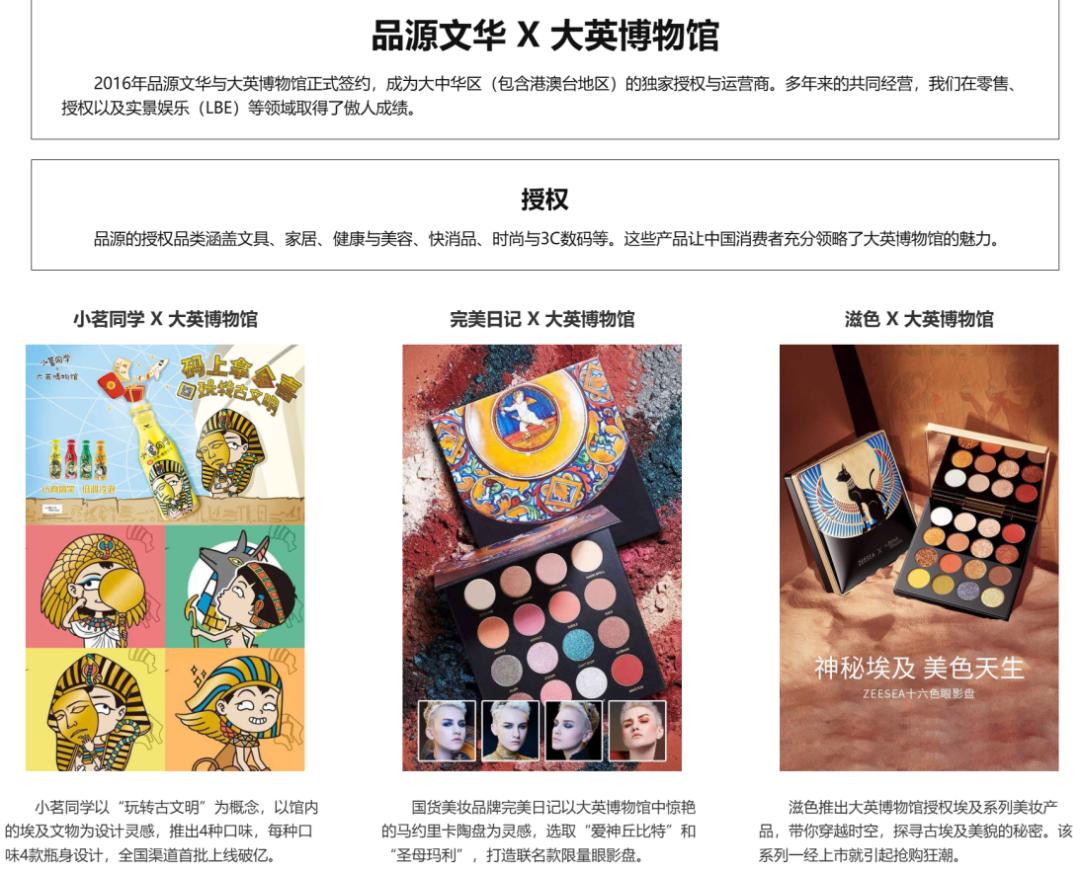 资料显示,品源文华负责大英博物馆IP资产的深度开发、商品授权、营销授权、体验式零售授权以及内容产品的开发和运营,目前已促成该文博IP与亚马逊、欧莱雅、完美日记、伊利牛奶、小茗同学、雀巢、小米手机、晨光文具、野兽派等近百个品牌的合作。