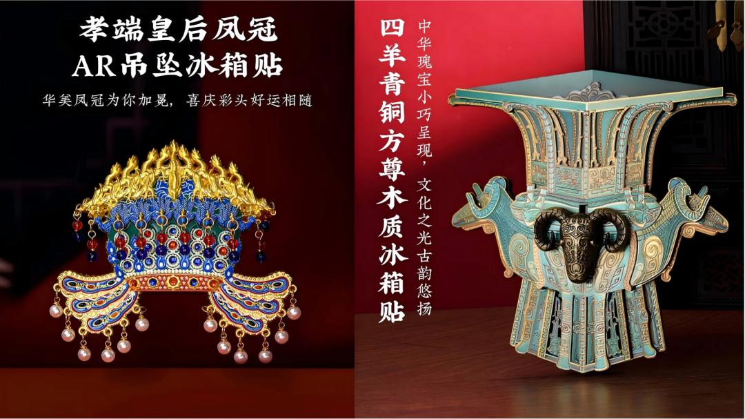 比如国家博物馆中热销的四羊青铜方尊木质冰箱贴等多款冰箱贴内置了灯光模组,可作夜灯使用;更加畅销的孝端皇后凤冠AR吊坠冰箱贴,不仅等比例一比一复刻了华美璀璨的明孝端皇后凤冠,还设计了AR功能,扫码就能“体验”把凤冠戴在自己头上——这种前沿互动技术,正在成为文创纪念品的“标配加分项”。
