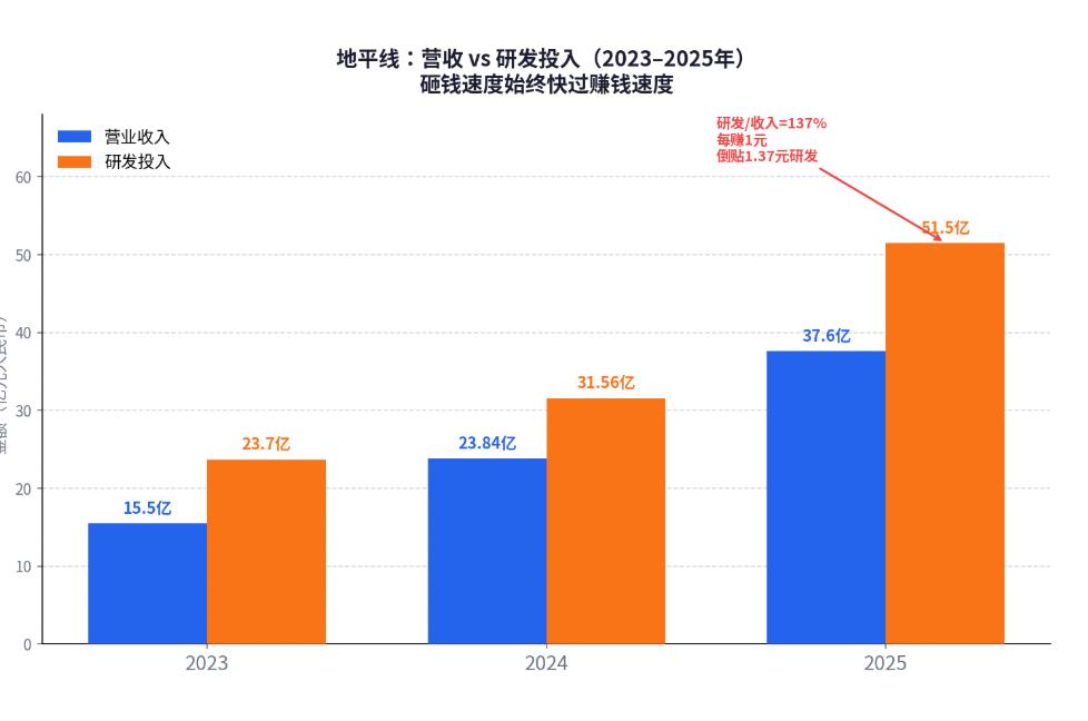 最核心的压力还是在财务侧,2025年地平线研发投入约51亿,营业收入约37亿,相当于每赚一块钱要倒贴1.37元回去。星空需要量产上车、形成规模,才能让这个财务逻辑翻转。在此之前,地平线是用资产负债表在换市场地位。2025年地平线全年营收37.6亿,经调整净亏损28.1亿元,同比扩大67.3%。