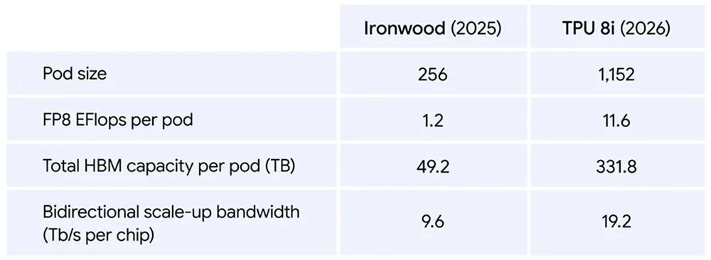 TPU 8i则拥有更高的内存带宽,专为对延迟最为敏感的推理工作负载而设计,旨在处理众多专业智能体复杂、协作、迭代的工作。