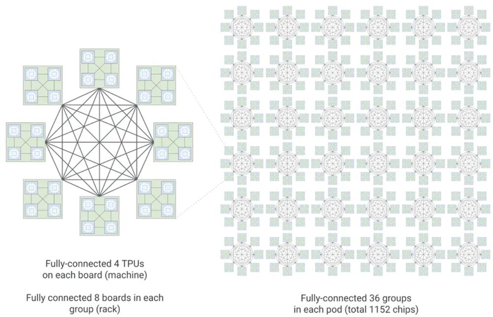 TPU 8i采用分层式Boardfly拓扑结构,从4张完全连接的芯片构建而成,逐步扩展为8个完全连接的电路板组,36个这样的电路板组可以完全连接成一个TPU 8i Pod。