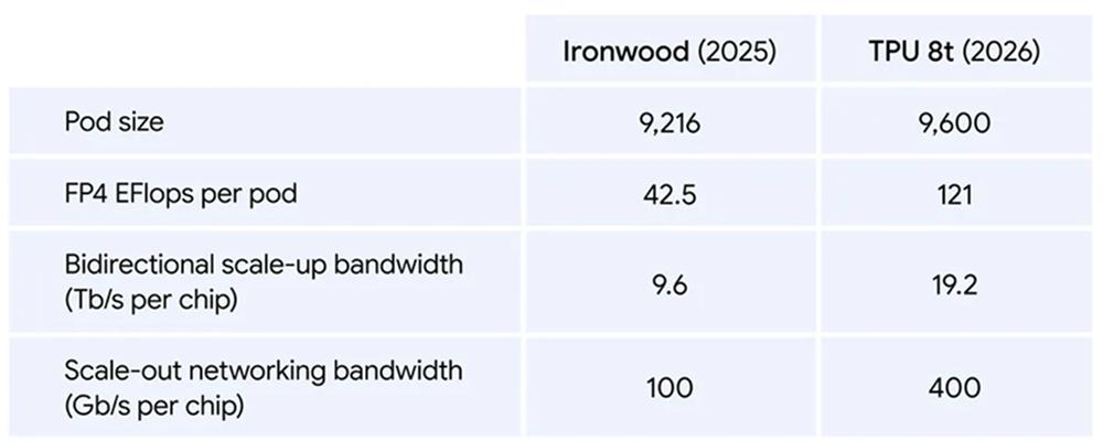 TPU 8t和TPU 8i的每瓦性能可提升至上一代产品Ironwood的2倍。