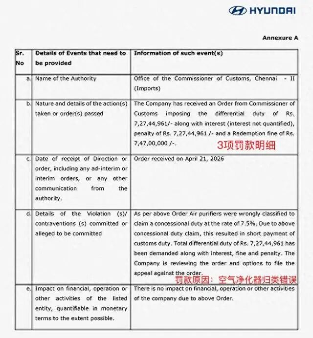 现代汽车印度有限公司发布公告显示,公司于4月21日收到金奈第二进口海关专员办公室发出的命令,称该公司进口的空气净化器归类错误,导致其误享受了7.5%的优惠税率,这部分的钱需要补缴,金额是7274.5万印度卢比。
