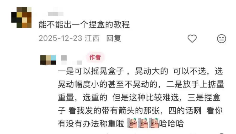 “摇晃大的不选,轻的不选,方盒子的长边按不动的地方就是里面有盒子,都记住了。”