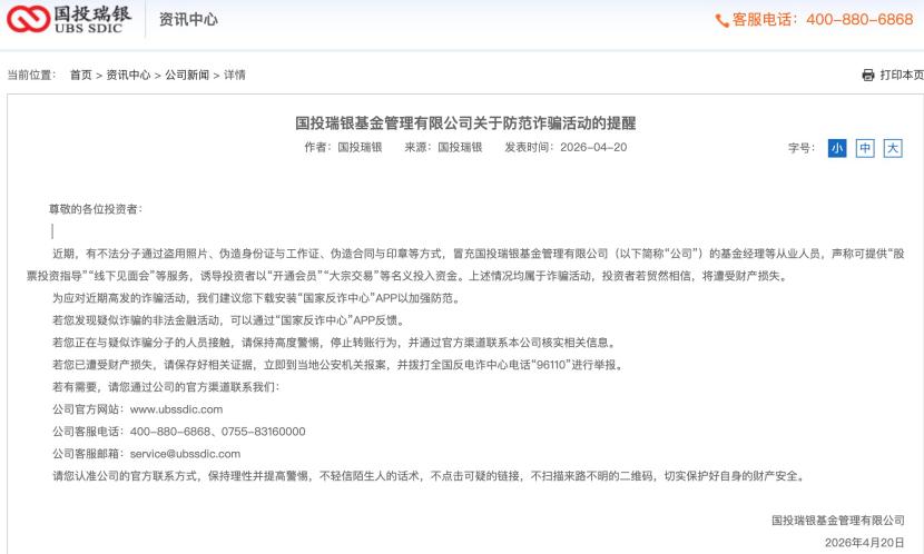 4月20日,国投瑞银发布本月第二份防诈骗公告,指出近期有不法分子通过盗用照片、伪造身份证与工作证、伪造合同与印章等方式,冒充国投瑞银的基金经理等从业人员,声称可提供“股票投资指导”“线下见面会”等服务,诱导投资者以“开通会员”“大宗交易”等名义投入资金。