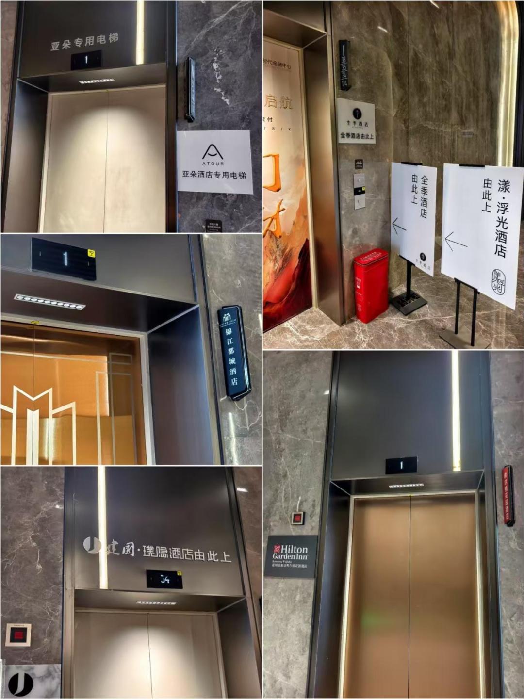 六家酒店的前台一字排开,各自占据着大堂的一角。电梯间更为夸张,每一家酒店都在电梯入口设置各自水牌,指示宾客应该乘坐哪部电梯抵达哪家酒店。