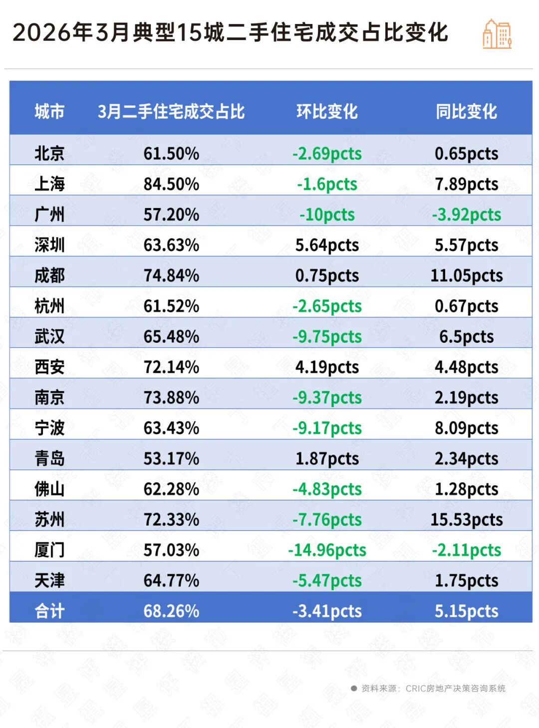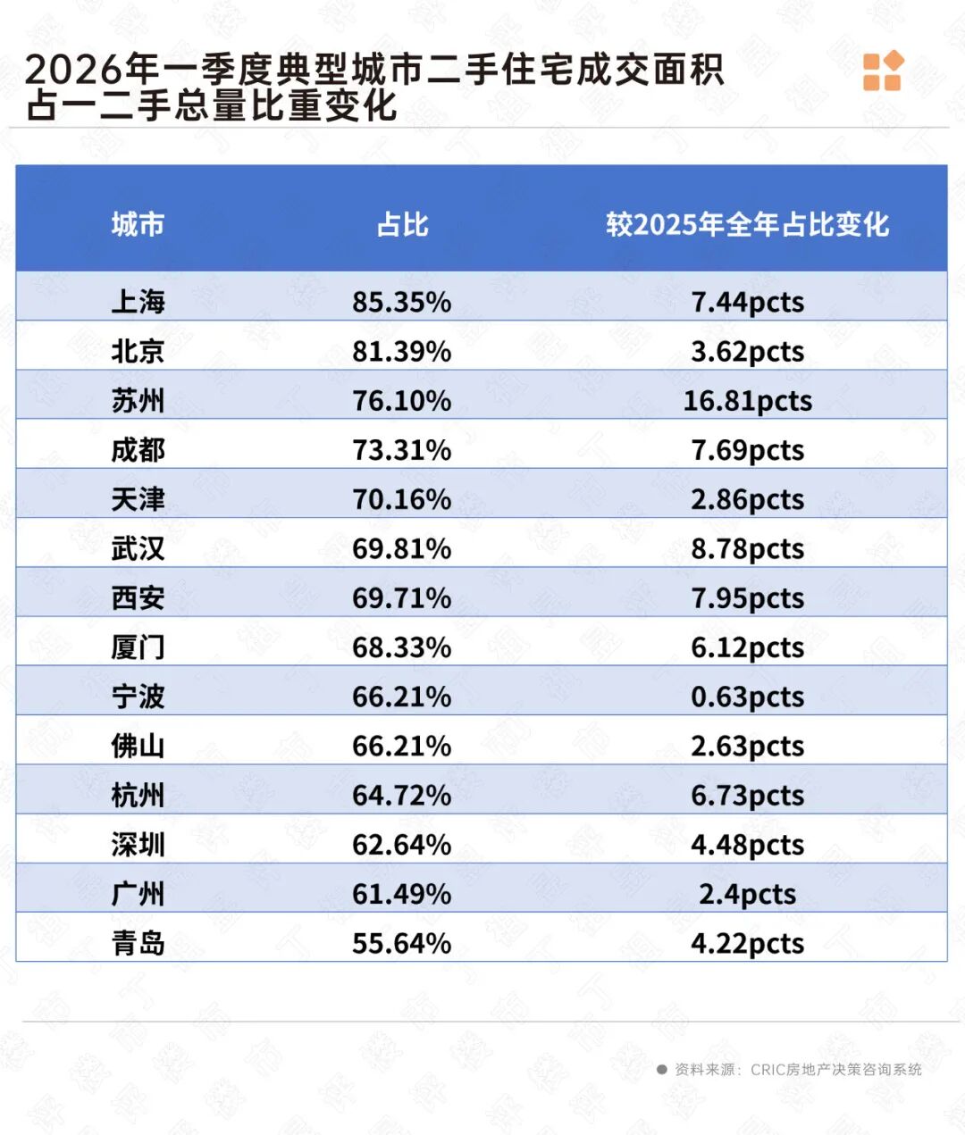 截至2026年一季度,这一趋势进一步强化。上海、北京二手住宅成交占比已达到80%以上。