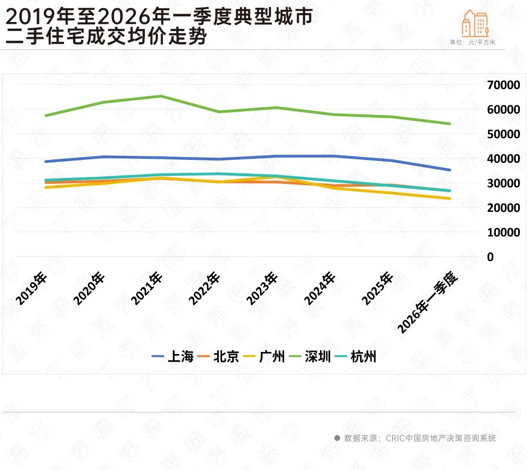 具体来看,上海2026年一季度二手住宅成交均价为35210元/平方米,同比去年一季度下降15%左右;北京二手住宅均价在2025年结束了自2022年以来三年的下跌后,至2026年一季度再次同比转跌,成交均价同比下降9.05%。广州2026年一季度二手住宅成交均价为23614元/平方米,较2023年成交均价高点时降了27%。