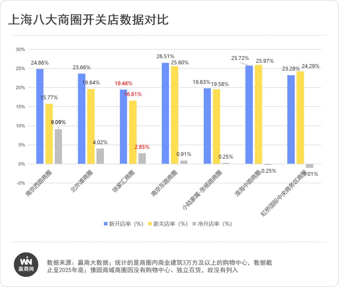 值得玩味的是,徐家汇商圈的新开店率19.46%在八大商圈中最低、新关店率16.61%倒数第二,但净开店率仍达到+2.85%,位列八大商圈第三。这反映出徐家汇商圈呈现出 “低开低关、稳中微增”的健康成熟态势——品牌更替频率虽不及南京西路活跃,但凭借极高的存量稳定性和正向的净流入,实现了“开店慢但关店更慢”的良性结构。