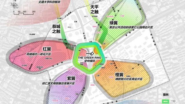 与此同时,徐家汇-01更新单元规划已于2025年公示。该地块是徐家汇中央活动区的核心区域,北邻衡复历史文化风貌区、西连上海交通大学科创板块、南接徐家汇体育公园,地缘优势显著。方案以“上海极具辨识度的国际级潮流消费中央活动区”为发展愿景,创新性提出“一心四翼双触角”的蝶型功能结构——以徐家汇空中绿环为“蝶身”,以四种主题色勾勒多元功能的“四翼”,分别串联历史文脉与科创活力的“双触角”。这标志着徐家汇商圈的发展从单点更新迈向系统重构的新阶段。
