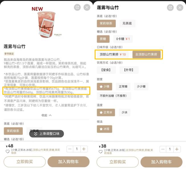 阿嬷手作贴心地为新品设置了两个付费门槛,分别是38元和48元两个价位。其中的10元差价,主要是在48元版本中,除了果茶本身的山竹含量有所增加外,还额外添加了30g顶部山竹果捞。