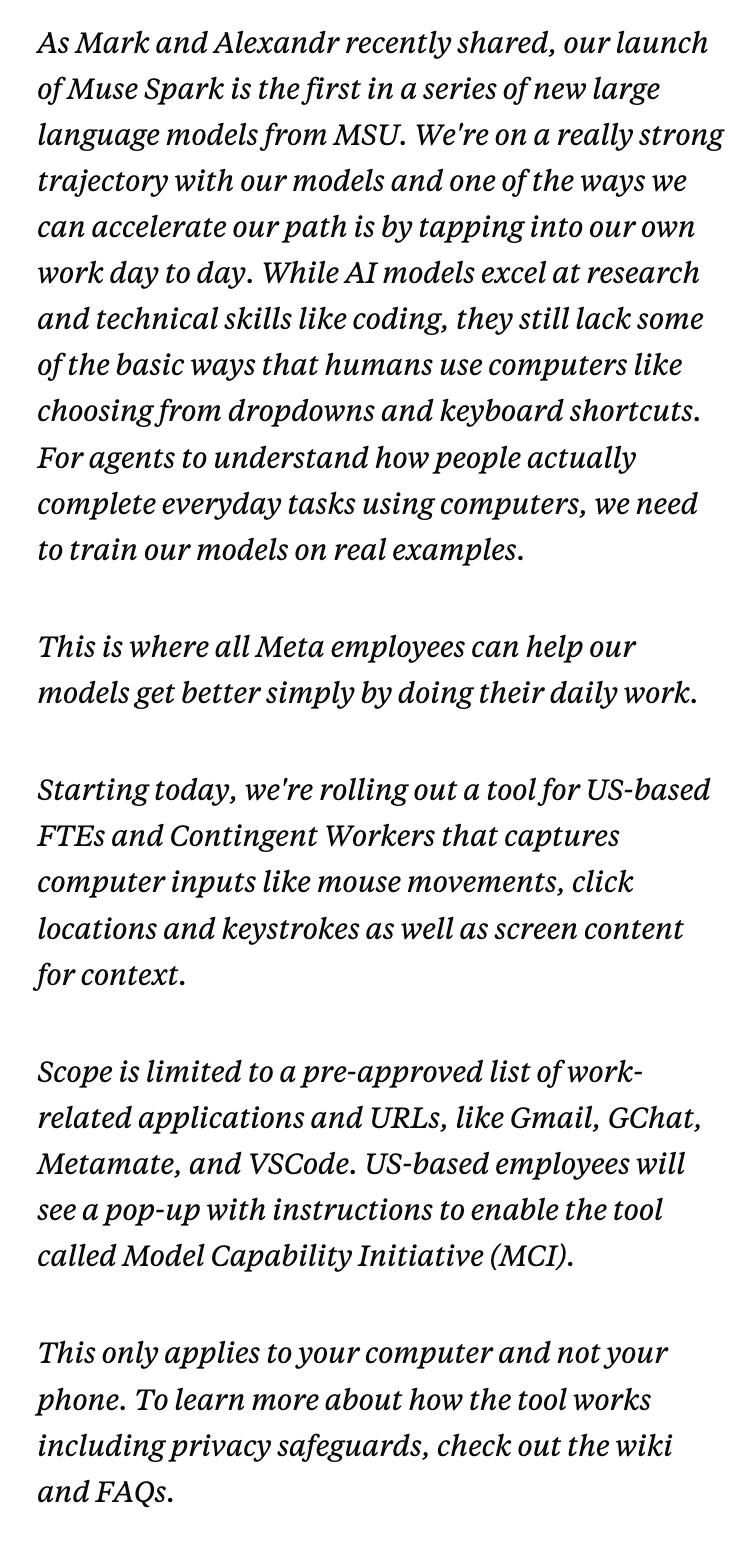 备忘录里有一句话特别刺眼:「这正是所有Meta员工通过日常工作中的一举一动,帮助我们的模型变得更好的机会。」