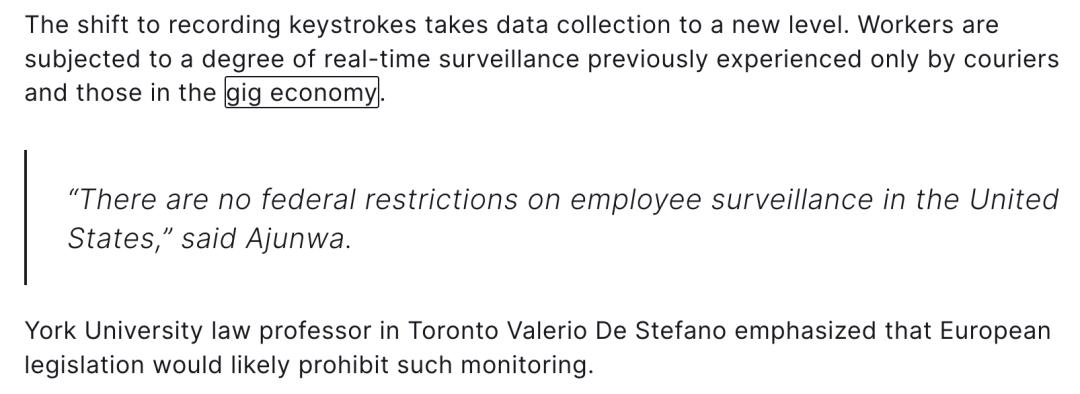 埃默里大学法学教授Ifeoma Ajunwa直言:「在美国联邦层面,对员工监控没有任何限制。」州级法律最多要求雇主「大致告知」。