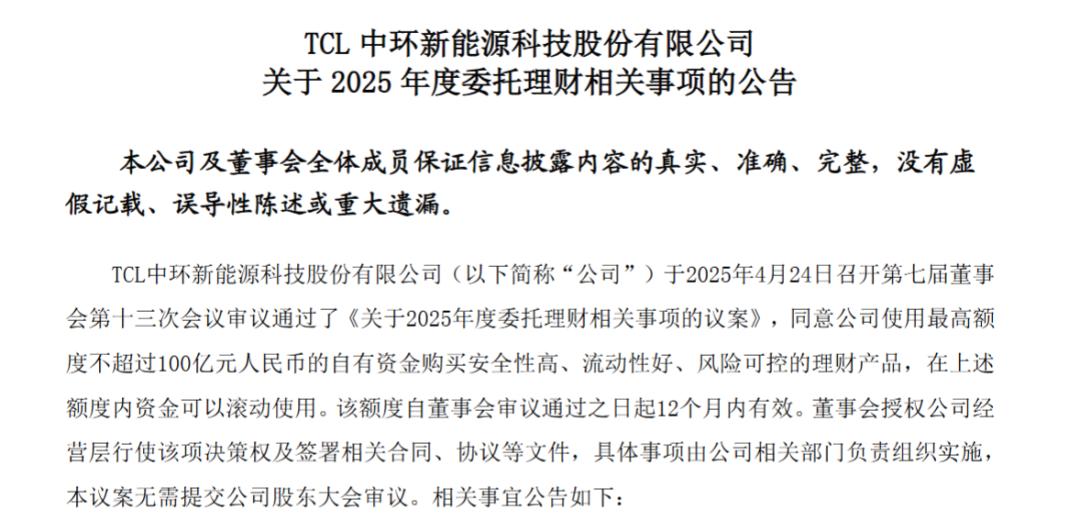 而更人咋舌的是,公司主业严重亏损之时,却再次抛出了不超过100亿元的大额理财计划,“有钱不回购”抱怨声音四起。实际上,TCL中环自2020年起,就持续进行年度大额闲置理财,2020年12月1日、2022年1月24日、2023年4月8日,2025 年 4 月 25 日,TCL中环相继发布的年度闲置资金理财额度,分别不超过50亿元、70亿元、100亿元、100亿元。