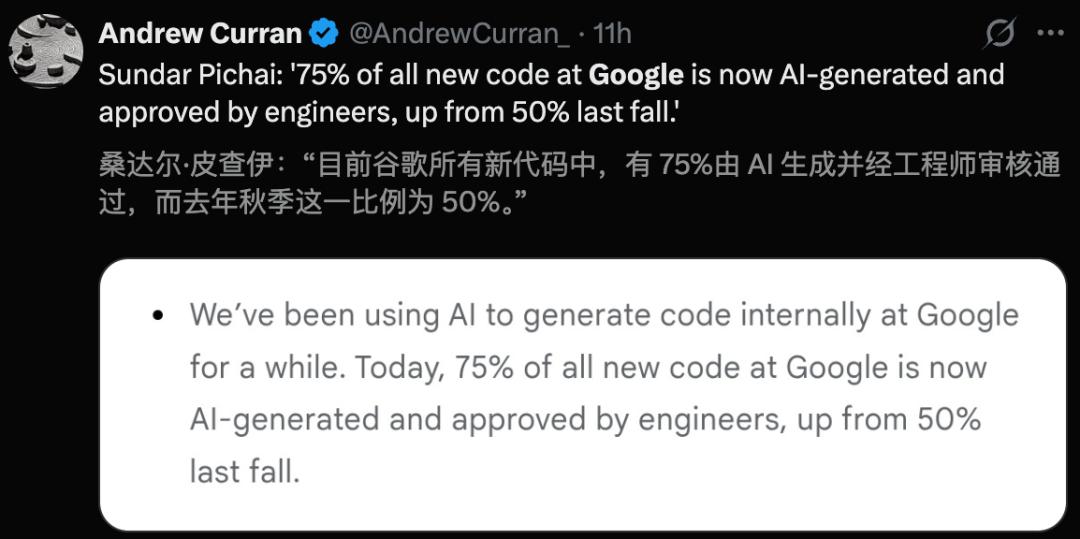 谷歌内部75%的新代码,现在由AI生成,工程师审核通过。