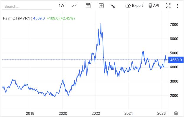 近10年棕榈油价格走势 图源:Trading Economics