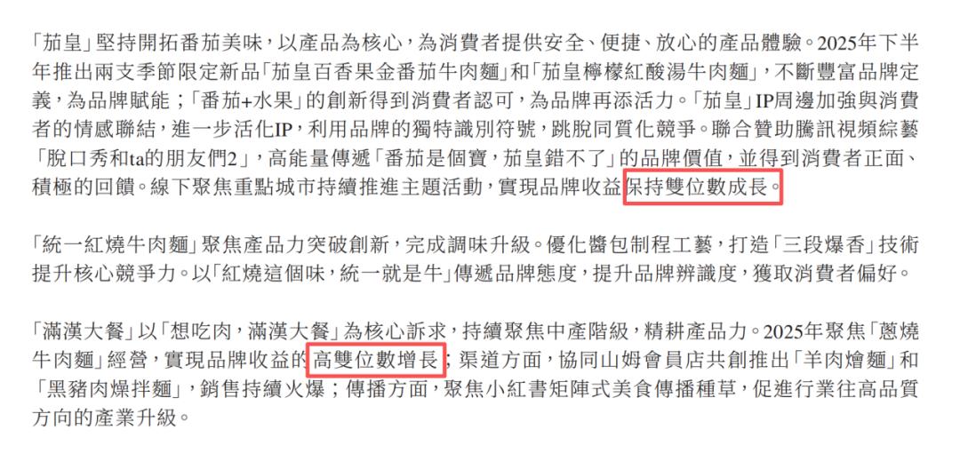 一是产品结构向高价格带迁移。康师傅2025年业绩公告显示,高价袋面销售占比达39%;统一在2025年财报中提到,食品业务增长的主要驱动力来自高端产品,其中,“茄皇”和“满汉大餐”两款高端产品的全年收益保持双位数增长。
