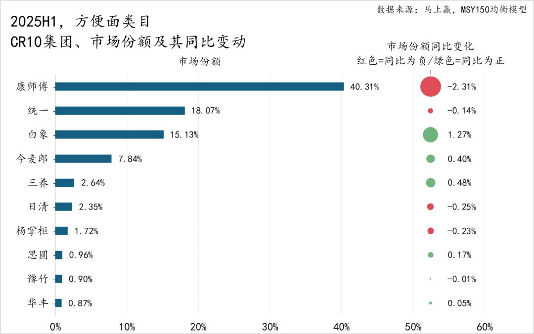 从市场份额的静态分布看,行业座次未发生变化,行业头部位置依然稳固。马上赢数据显示,2025年上半年,康师傅市场份额为40.31%、统一为18.07%、白象为15.13%、今麦郎为7.84%、三养为2.64%。