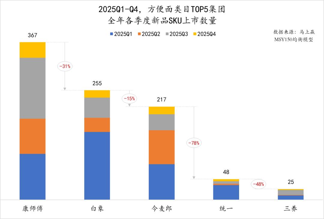 从新品推出数量看,根据马上赢数据,康师傅全年上市新品SKU达367款;白象和今麦郎紧随其后,分别为255款和217款;统一全年仅推出48款新品,三养25款。