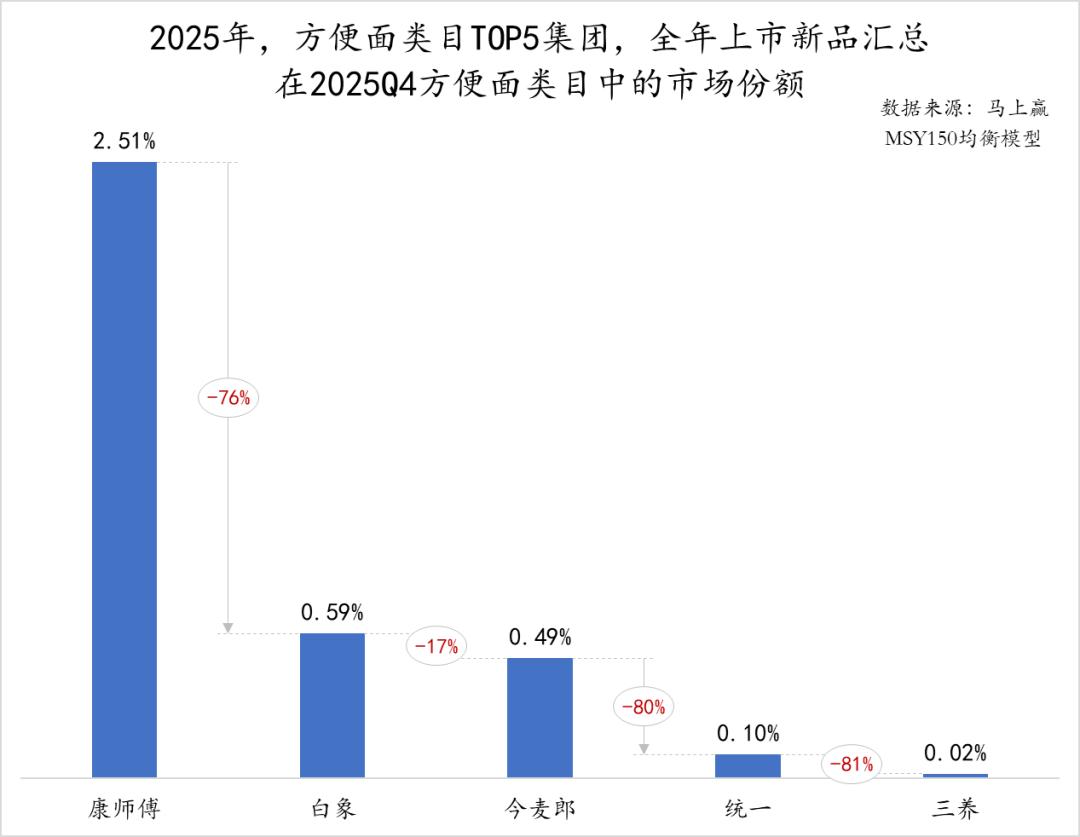 但大量上新并未带来相应的市场贡献。马上赢数据显示,2025年第四季度,康师傅新品在整体市场中的份额占比约2.5%,白象、今麦郎的新品贡献均不足1%,统一、三养的新品份额贡献则均不足0.1%。换句话说,白象和今麦郎投入了大量资源推新,但新品对市场的实际拉动效果非常有限。
