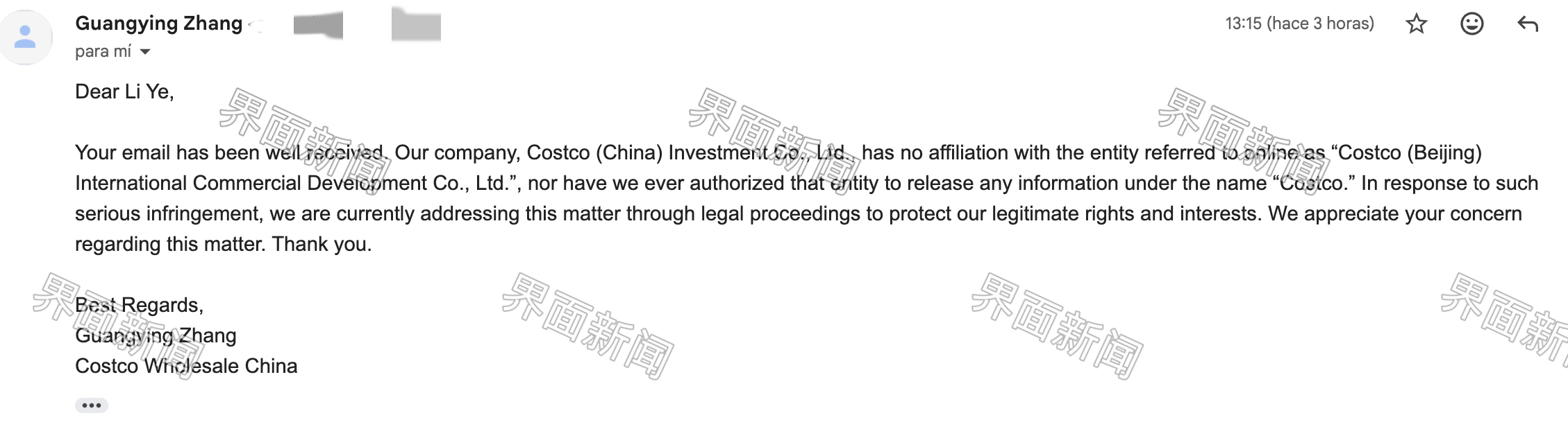 4月23日,该请求被转至开市客中国。在回复中,开市客中国监事、法务总监张光莹向界面新闻称,我公司开市客(中国)投资有限公司与网上提及的“开市客(北京)国际商业发展有限公司”没有任何关联,也从未授权该实体以“开市客”的名义发布任何信息。针对此类严重的侵权行为,我公司目前正通过法律途径维护自身合法权益。