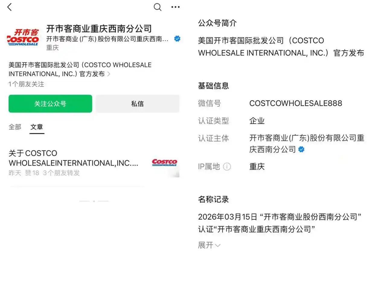 此外,据成都日报社官方账号《锦观新闻》报道,今年4月,微信公众号“开市客商业重庆西南分公司”发布推文,称“美国开市客国际批发公司(COSTCO WHOLESALE INTERNATIONAL, INC.)”将在成都投资建设西南首家仓储会员店。