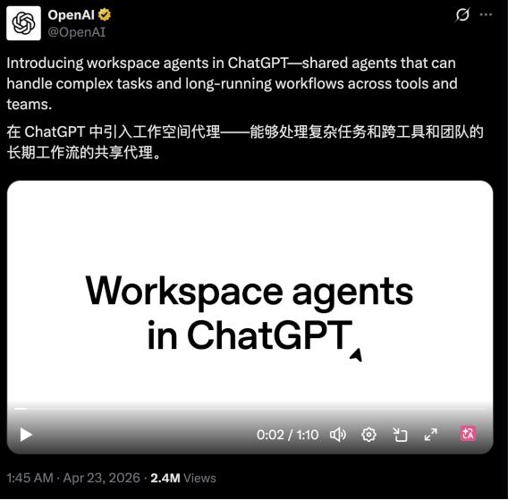 OpenAI凌晨发布了Workspace Agents,GPTs开始进入倒计时。