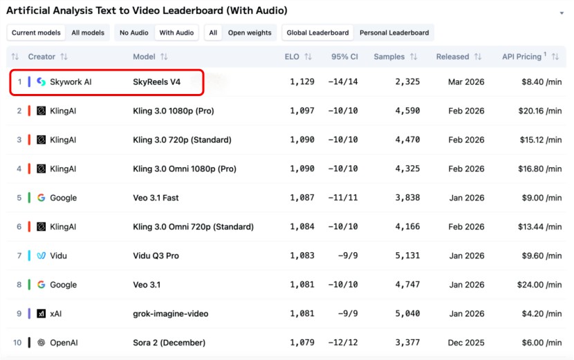 SkyReels-V4发布时在Artificial Analysis 文生视频 Text-to-Video(With Audio)中的排名表现