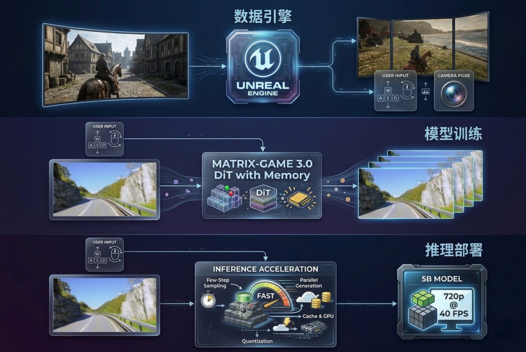 Matrix-Game 3.0数据—模型—推理 示意图
