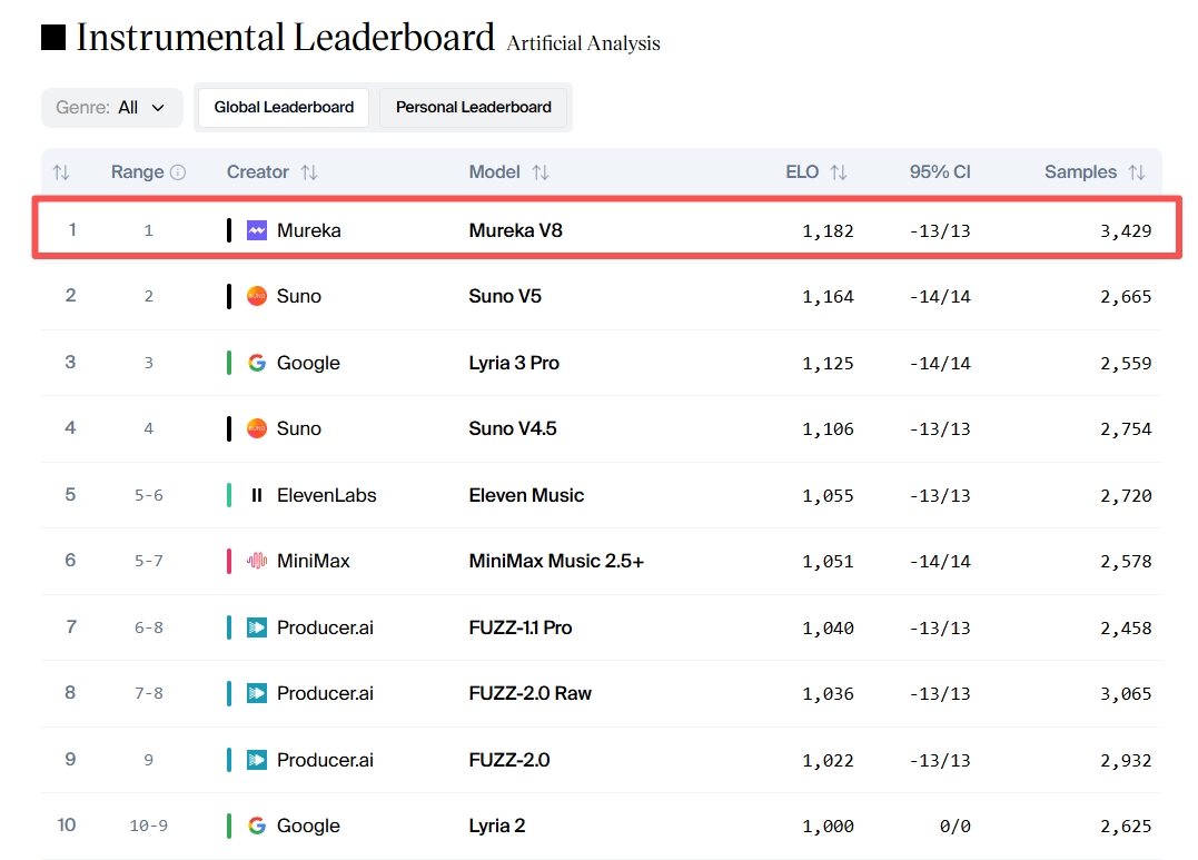 Mureka V8在Artificial Analysis Instrumental(乐器)中的排名表现
