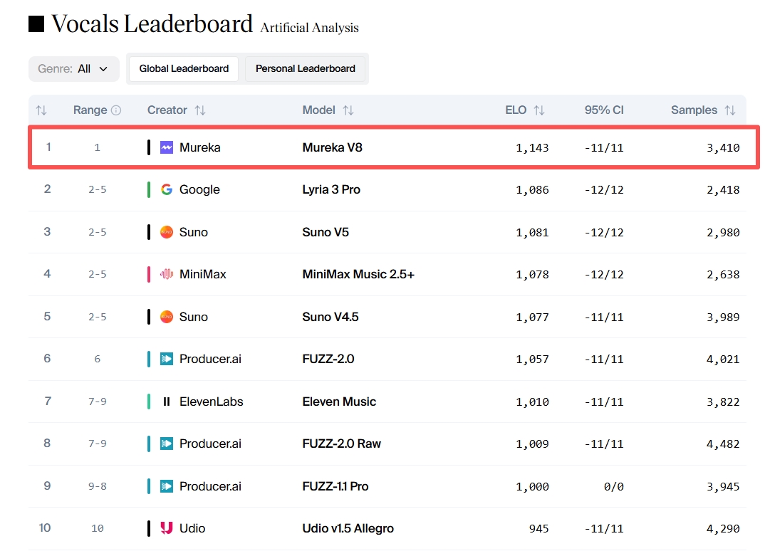 Mureka V8在Artificial Analysis Vocals(人声)中的排名表现