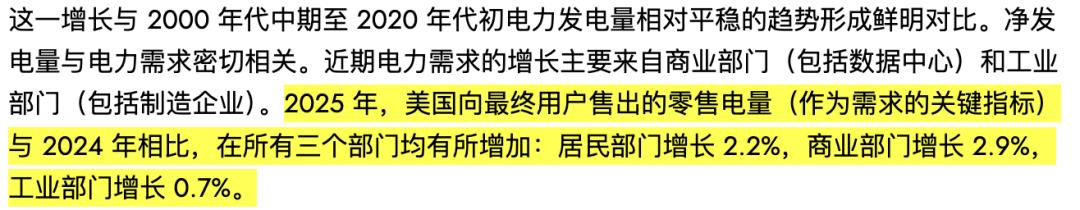 EIA最新数据显示,2025年美国零售电力销售额全面上涨,其中商业部门涨了2.9%,工业部门涨了0.7%。EIA把商业用电的暴增明确归功于数据中心。