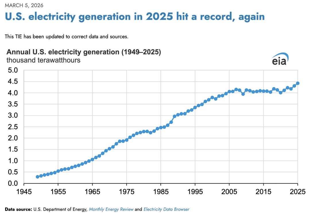 按照美国能源信息署(EIA)数据,2025年全美发电量创下历史新高,达到4.43千TWh。如果这30GW算力持续满载运行一整年,大约消耗262.8TWh。