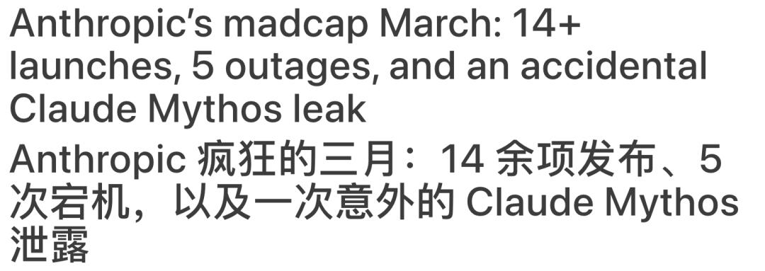 The New Stack曾在3月28日一篇报道中回顾Anthropic「疯狂的三月」,称其在这个月推出超过14项更新,同时发生至少 5 次宕机,以及Opus 4.6频繁出现高错误率。