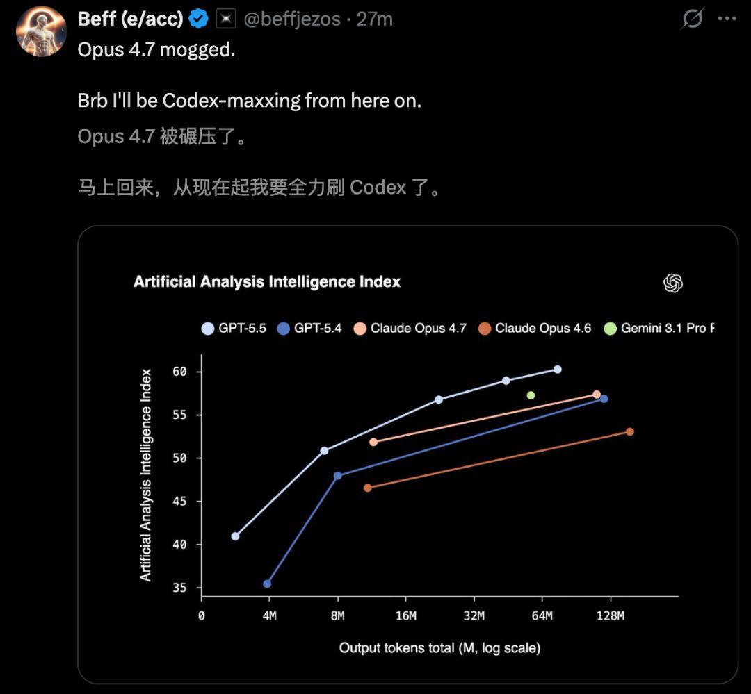 换句话说,GPT-5.5是一个「你为更强的智能付更多的钱」的溢价产品。相比之下,GPT-5.4大概率会继续作为性价比之选存在。