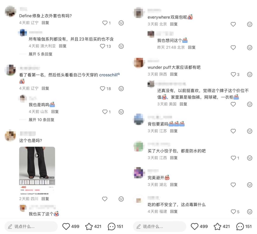 这波新闻一出,花大价钱买过 Lululemon 的老粉们直接破大防。连夜翻箱倒柜拿着水洗标到处对线,从瑜伽裤到小发带,恨不得拿显微镜全给盘一遍。