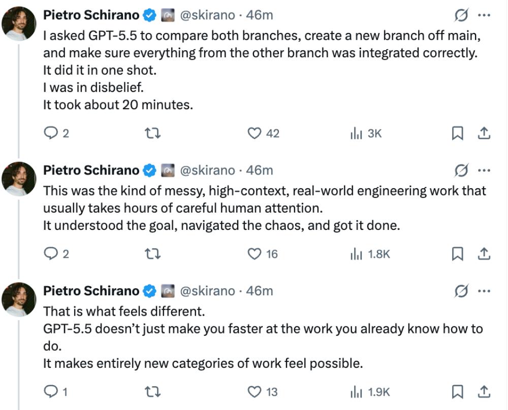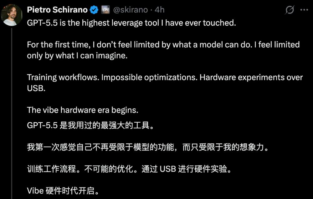 Pietro Schirano感慨道:“GPT-5.5是我用过的最强大的工具。我第一次感觉自己不再受限于模型的功能,而只受限于我的想象力。训练工作流程、不可能的优化、通过USB进行硬件实验。Vibe硬件时代开启。”