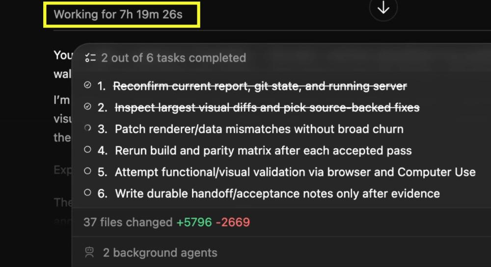 AI工程师Peter Gostev深度体验了GPT-5.5,并放出了他用GPT-5.5工作的几个例子。他分享称,用户可以给GPT-5.5设定好步骤提示词,GPT-5.5就会按照步骤逐项完成,亲测至少可以稳定自主运行7个小时。